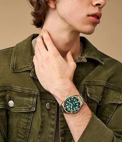 This 42mm Dalton features a green sunray dial, three-hand movement and gold-tone stainless steel bracelet.